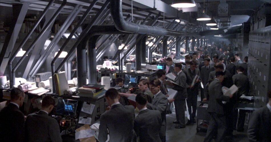 Ambientes abarrotados de pessoas e maquinários pesados, realizando tarefas mínimas, criam a atmosfera do filme, onde a individualidade é quase inexistente. Tudo é embalado pela eterna repetição de “Aquarela do Brasil”, clássico de Ary Barroso. ‘Brazil’ mistura humor negro, crítica social e uma estética visual única para explorar temas como burocracia, alienação e opressão. A burocracia é retratada como uma força opressiva e absurda, com formulários intermináveis, departamentos confusos e sistemas que priorizam regras acima das pessoas. Pequenos erros, como uma digitação incorreta, levam a caos generalizado.